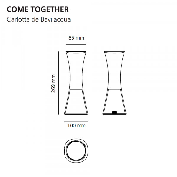 La forma de difusión de la luz de la luminaria Come Together se realiza a través de una lente TIR óptica primaria y un reflector blanco interno secundario. La lámpara de sobremesa Come Together tiene la forma de un instrumento capaz de acompañar al hombre a través del espacio. El cuerpo de esta luminaria es un dispositivo óptico transparente con gradientes para transportar y distribuir la luz: funciona como un tubo de luz "vacío" para lograr ligereza e inteligencia óptica.