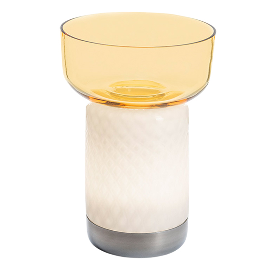 Una lámpara portátil explora la conexión entre la luz, la comida y la convivencia. Es una lámpara portátil que interactúa con los objetos de la mesa. Un cuerpo de cristal de leche con textura blanca difunde la luz, creando un ambiente relajado, mientras que el hueco superior alberga un cuenco de cristal diseñado para albergar comida para compartir. Este puede combinarse o alternarse con un cuenco más alto y otro más ancho -casi un plato- en la parte superior. Los cuencos -y la propia lámpara- están hechos de vidrio trabajado a mano, lo que los convierte en piezas únicas cuya textura, transparencia y color generan un diálogo especial entre la luz y los alimentos, difuminando los límites entre ellos. Se ha prestado la máxima atención a los detalles para hacer justicia al propio objeto y a los demás elementos con los que interactúa. La luz desempeña un papel fundamental en la creación de una atmósfera perfecta, interactuando con otros elementos de la mesa y fomentando el intercambio y la convivencia.