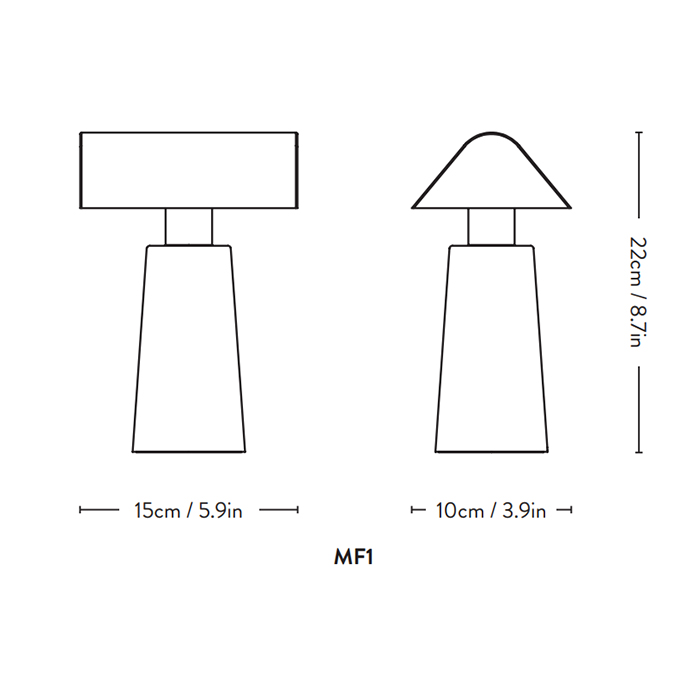 La lámpara de sobremesa Caret cuenta con una pantalla y base fabricadas en metal hilado y soldado. El compartimento de la batería está fabricado en ABS moldeado.