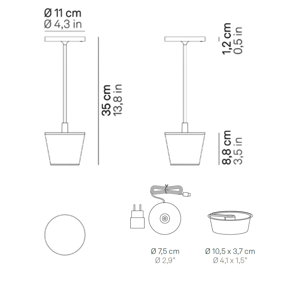La lámpara está equipada con un sistema de control electrónico que monitoriza la autonomía restante de la batería y asegura un flujo luminoso constante hasta su descarga total. Esto permite optimizar las recargas y realizarlas correctamente. Incluye una base de carga por contacto y cargador. Puede personalizarse con pantallas que se venden por separado.