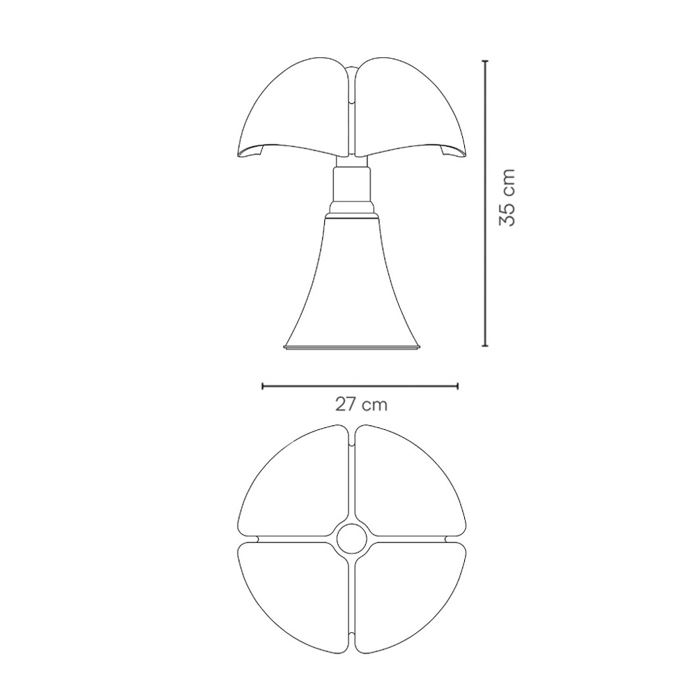 Lámpara de mesa Minipipistrello es un ícono de diseño en versión miniatura, ahora portátil y versátil gracias a la tecnología LED. Este modelo ofrece luz difusa y está equipado con un telescopio de acero inoxidable satinado. Su diseño incluye un difusor de metacrilato opalino blanco y una estructura con pomo de aluminio pintado. La versión portátil es dimmerable, sin cables, con batería recargable y sensor táctil, ideal para llevar a cualquier lugar: desde cenas románticas hasta terrazas al aire libre. Incluye cargador y batería con duración de hasta 6 horas, recargable también con power-banks compatibles.