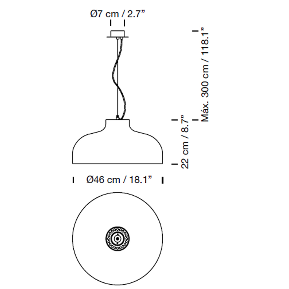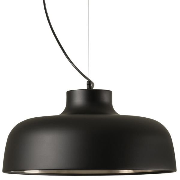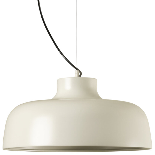 La lámpara de suspensión M68 consiste en una gran pantalla de aluminio, de cuyo centro superior parte el cable eléctrico y un diminuto cilindro metálico que realiza la transición entre la pantalla y el hilo de acero que la suspende.