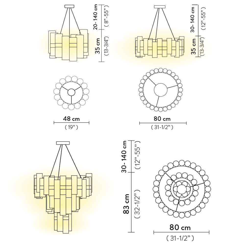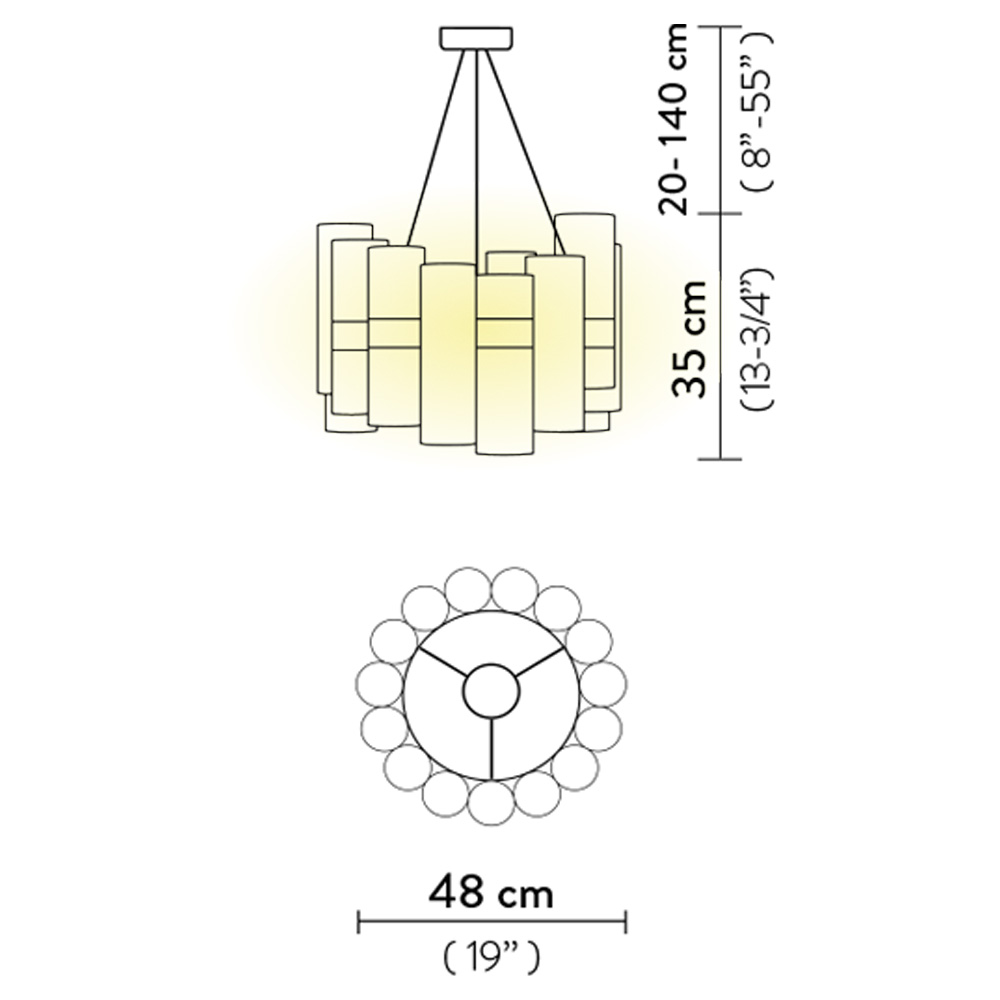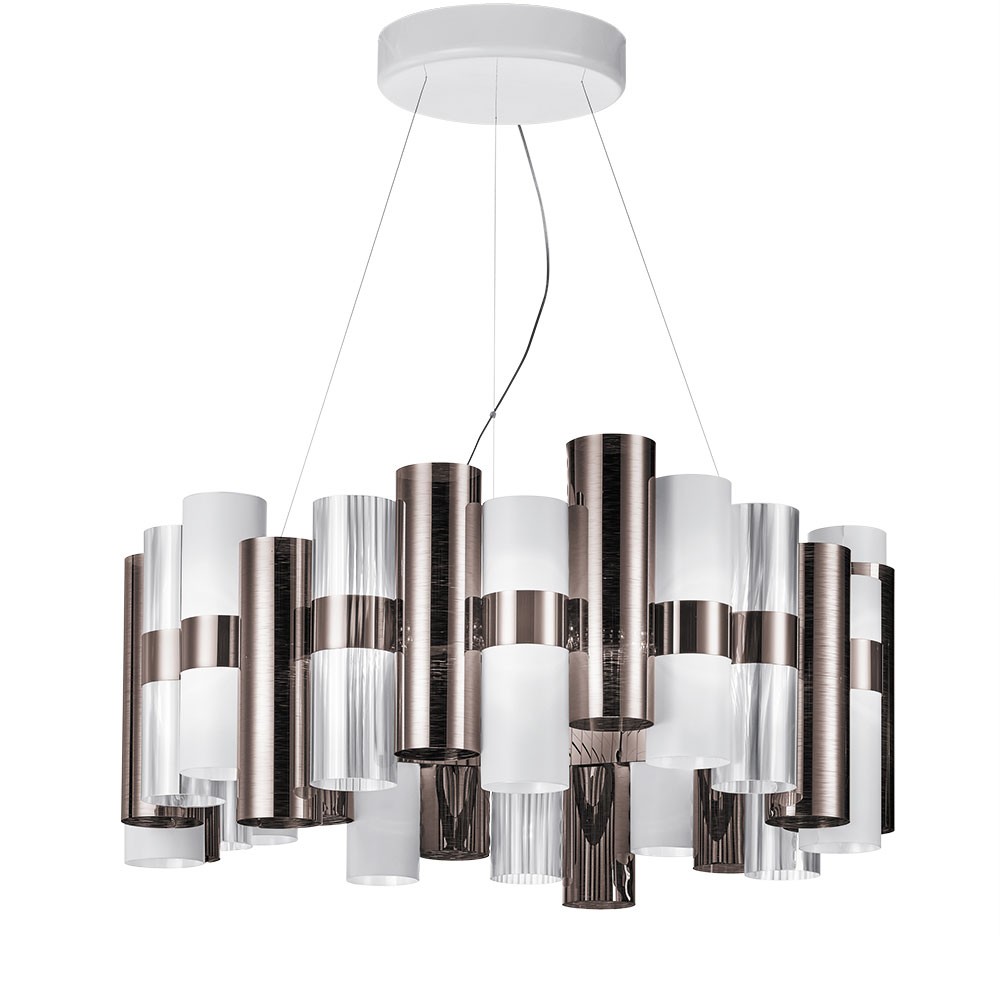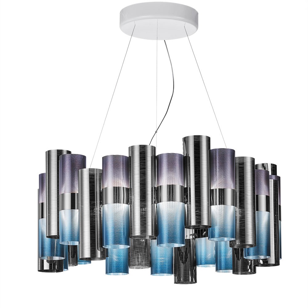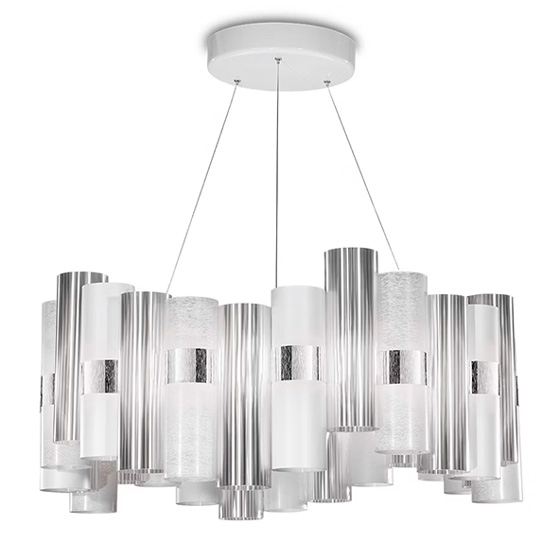 Lámpara colgante formadas por cilindros. Diseño por Lorenza Bozzoli.
