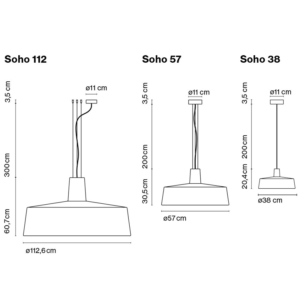 Soho se presenta como un reconocimiento las tradicionales lámparas que iluminaban mercados, tabernas y cafeterías. Su pantalla está hecha en polietileno rotomoldeado y el difusor en metacrilato opal.