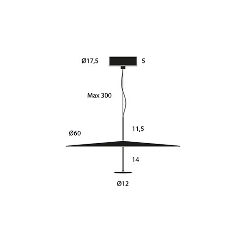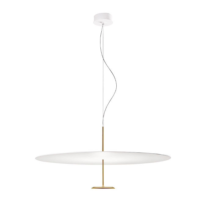 Una lámpara de suspensión con diseño moderno que es un conjunto de dos discos paralelos conectados por un tallo metálico que posee dos acabados diferentes.