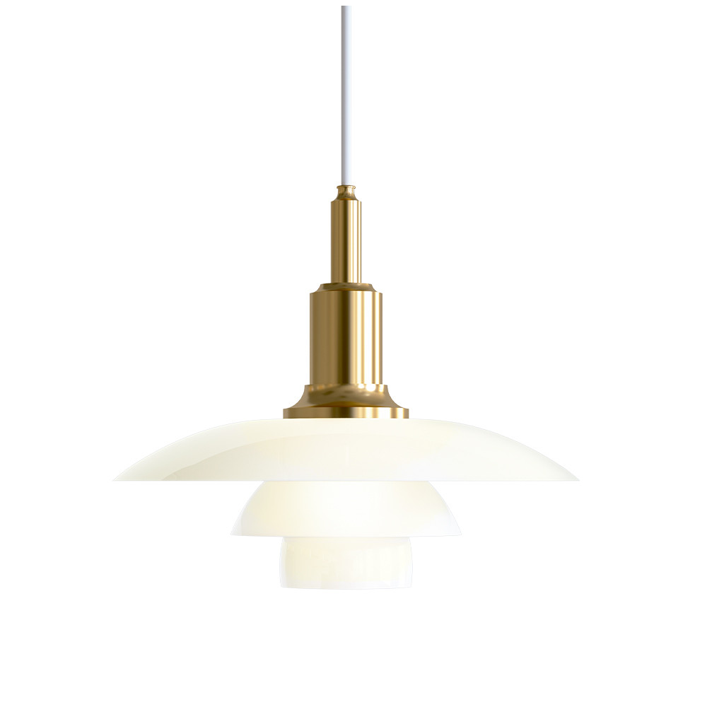 Esta lámpara de suspensión brinda una distribución de la luz suave, armoniosa y cómoda gracias a su vidrio ópalo blanco de tres pantallas soplado a mano que dirige su luz principalmente hacia abajo.
