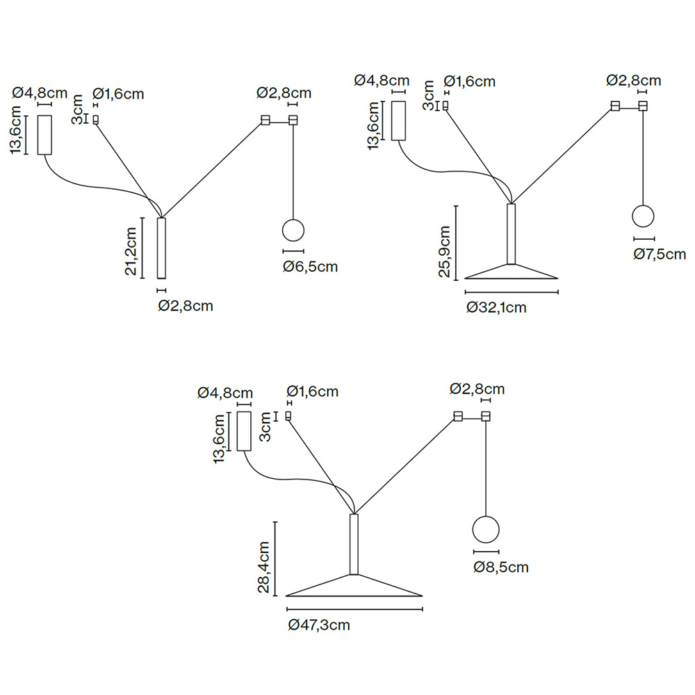 A este cilindro se le pueden añadir distintas pantallas cónicas en blanco perla, negro, beige, gris y rojo, y en varias medidas.