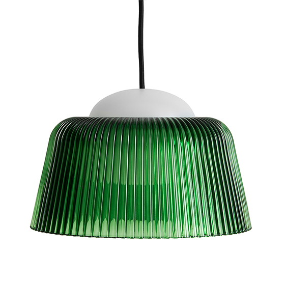 La lámpara de suspensión Brim es un colgante ambiental con pantalla de vidrio prensado de colores, inspirado en los clásicos colgantes de vidrio de épocas pasadas.