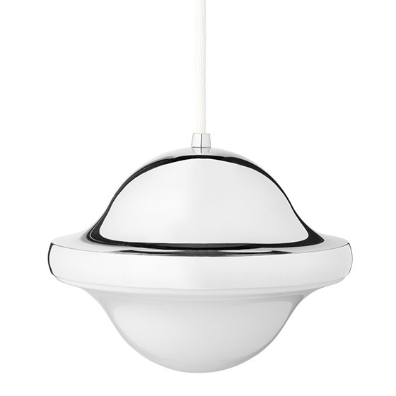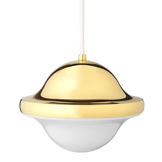 Lámpara suspendida con pantalla de acero cromado o latón. Dimensiones: Ø22x16,5h cm.