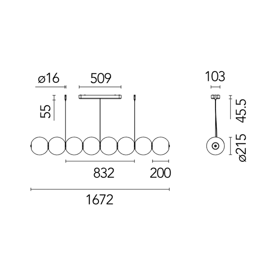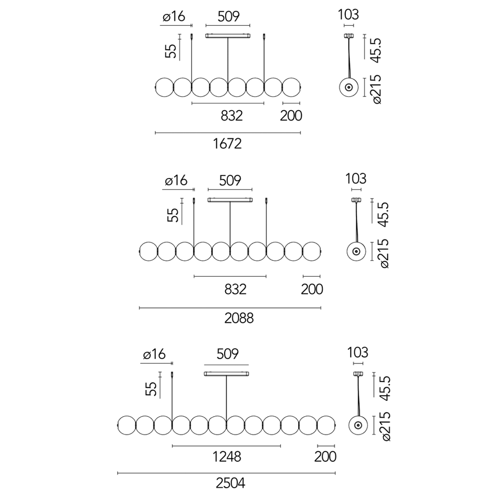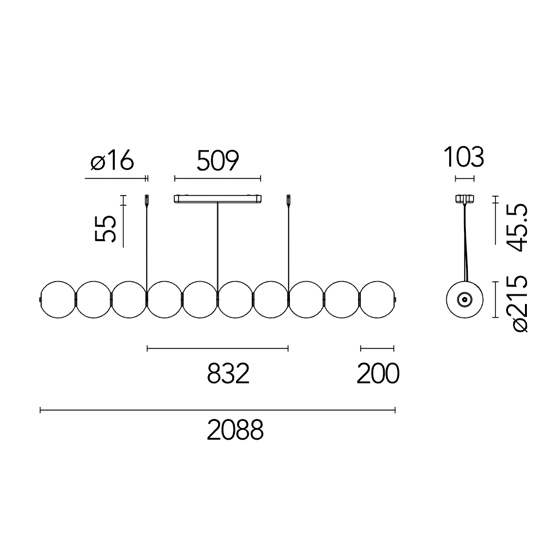 El regulador táctil integrado permite controlar de forma independiente la intensidad de la luz. Cuerpo recubierto por una secuencia de esferas de vidrio transparente soplado a mano separadas por espaciadores tradicionales. Se puede instalar en varias filas paralelas