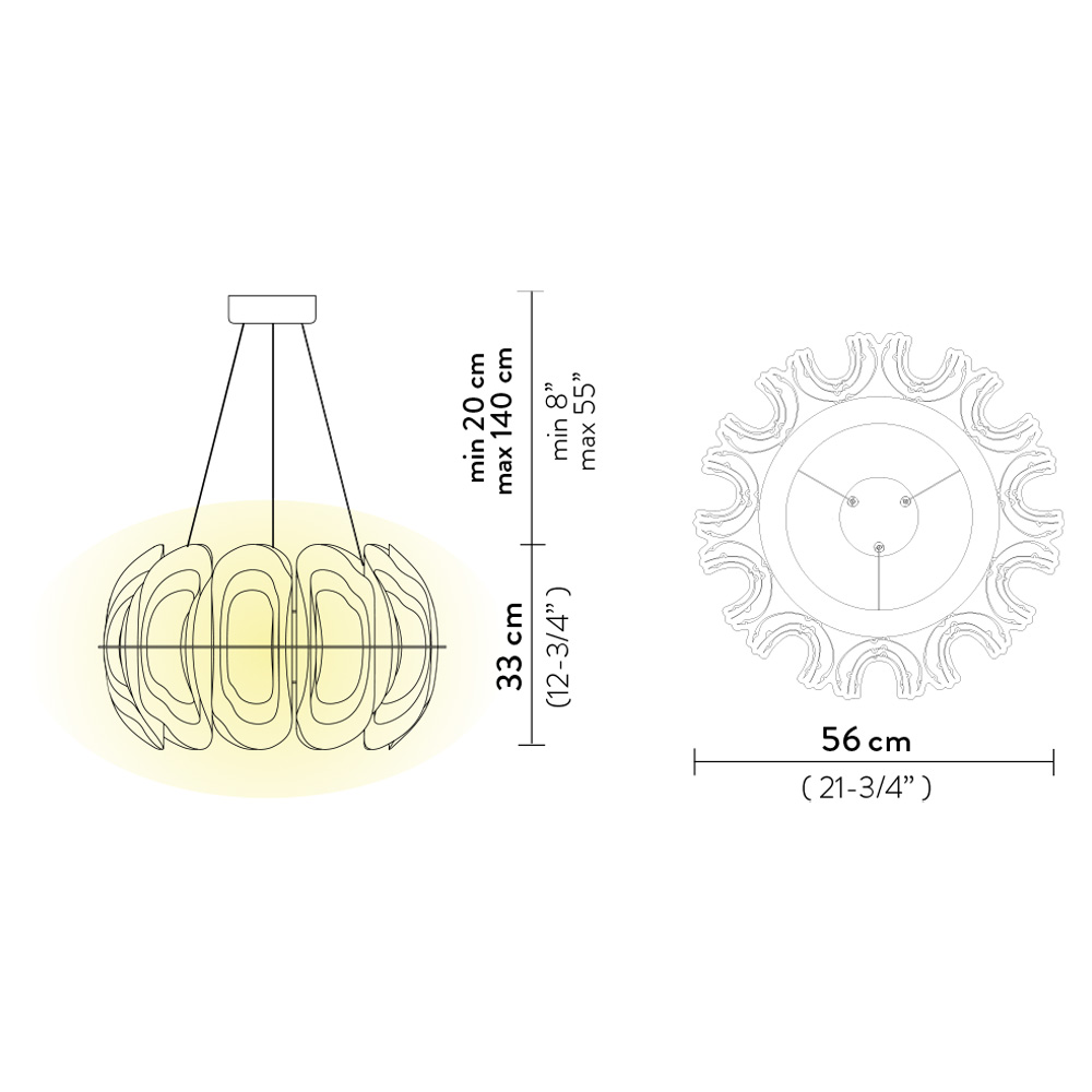 La estructura concéntrica en forma de concha de este nuevo diseño funciona como una narración visual de las distintas etapas de Slamp, representadas a través de los tres materiales que han marcado su evolución.