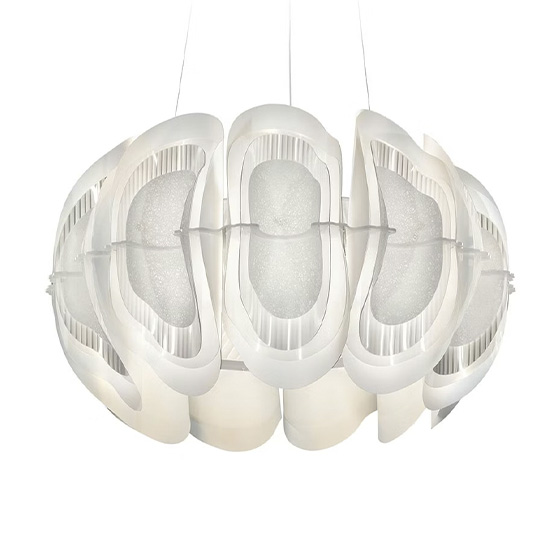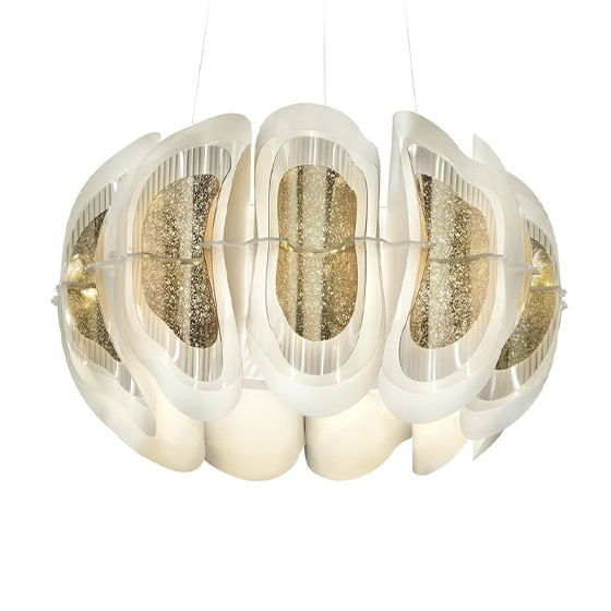 Fiordlys combina una estética contemporánea con guiños a las técnicas tradicionales del vidrio, convirtiéndose en una auténtica oda a los tecnopolímeros. En la capa más interna aparece el Opaflex®, de un sutil tono dorado que evoca los orígenes de la marca. En el centro se incorpora el Lentiflex®, introducido hace unos quince años, cuya textura enrejada genera efectos iridiscentes fluidos e inesperados. Finalmente, la superficie exterior utiliza una innovadora tecnología desarrollada en 2023: una lámina metalizada aplicada en frío, cuya textura permite que la luz atraviese el material y proyecte delicados juegos de luces y sombras.