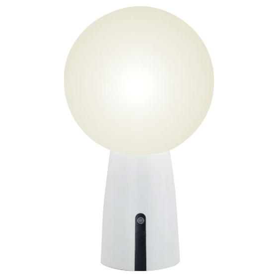 La lámpara sobremesa Olimpia Outdoor de Zafferano es portátil, funciona con batería y se puede recargar. En la base cuenta con un control táctil que permite encenderla y ajustar la intensidad de la luz.