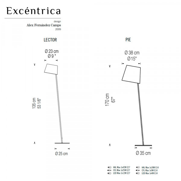 Lámpara de pie que permite como su nombre mismo indica una regulación excéntrica de su pantalla, y asi mismo, de la luz. Ideal para la lectura. Con una estructura metálica y una pantalla de tejido fabric.