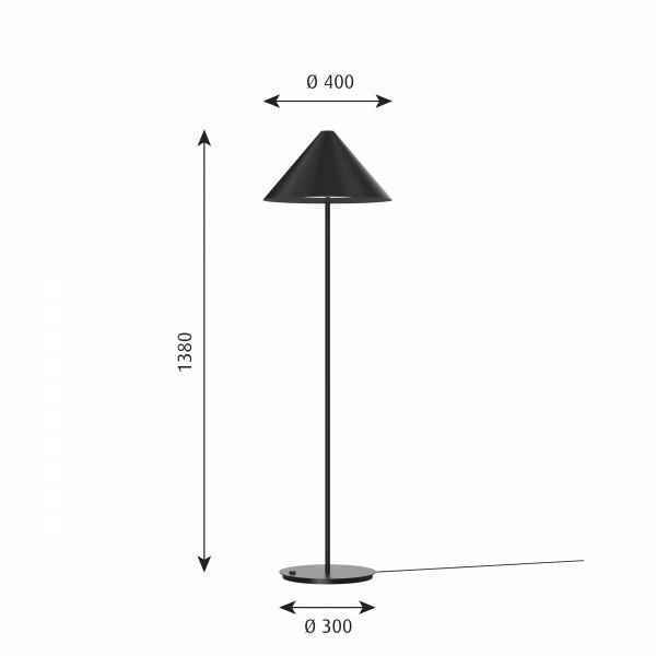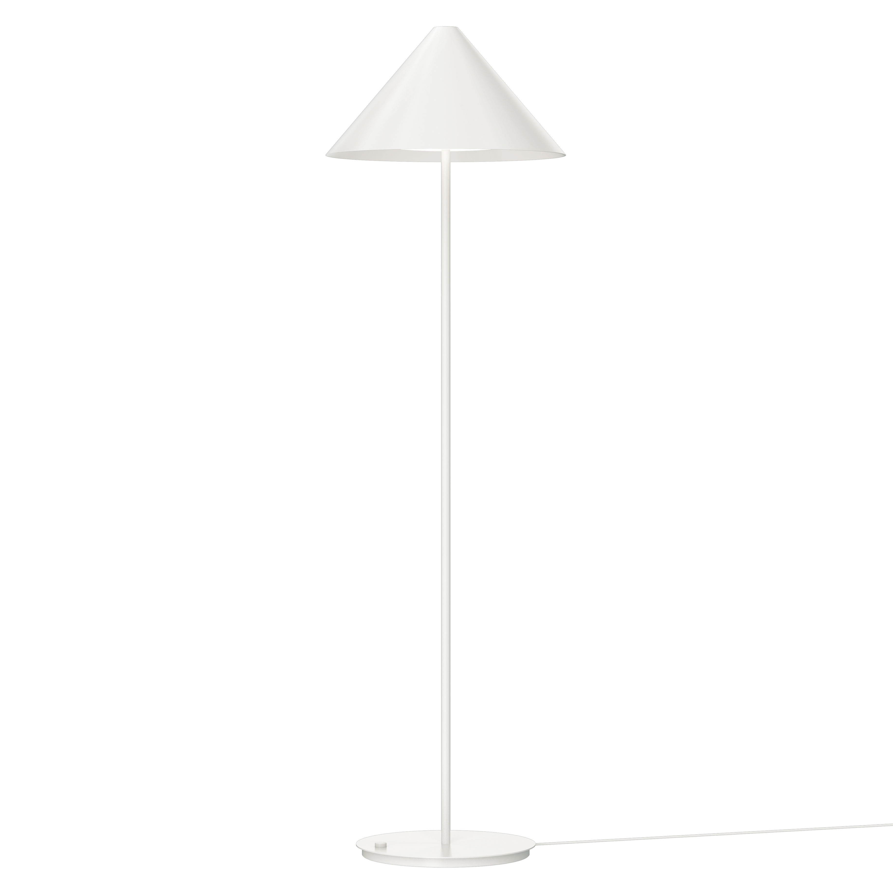 La cara interior blanca de cada pantalla refleja la luz a la perfección. Una discreta y uniforme abertura en la parte superior de cada pantalla proyecta una suave luz hacia arriba para crear más ambiente en cualquier espacio. Keglen de pie se basa en el mismo concepto de familia que la lámpara de suspensión de Ø 400. Empleando el mismo tamaño de pantalla, el vástago toma forma hasta convertirse en el difusor inferior, doblándose hacia dentro como sucede con la lámpara de sobremesa.