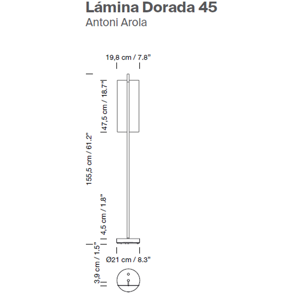 Lámpara pie con pantalla metálica plana dorada. Dimensiones: Ø21x155,5 cm.