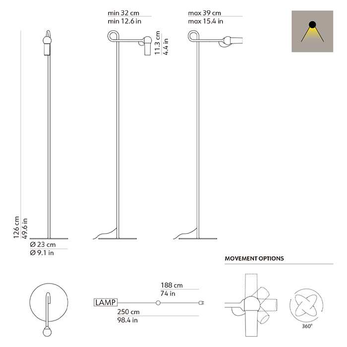 La curvatura en el vértice añade resistencia a su cuerpo ligero y delgado, mientras que un elemento magnético permite la rotación completa del difusor. También está disponible en versión de sobremesa como lámpara de lectura.