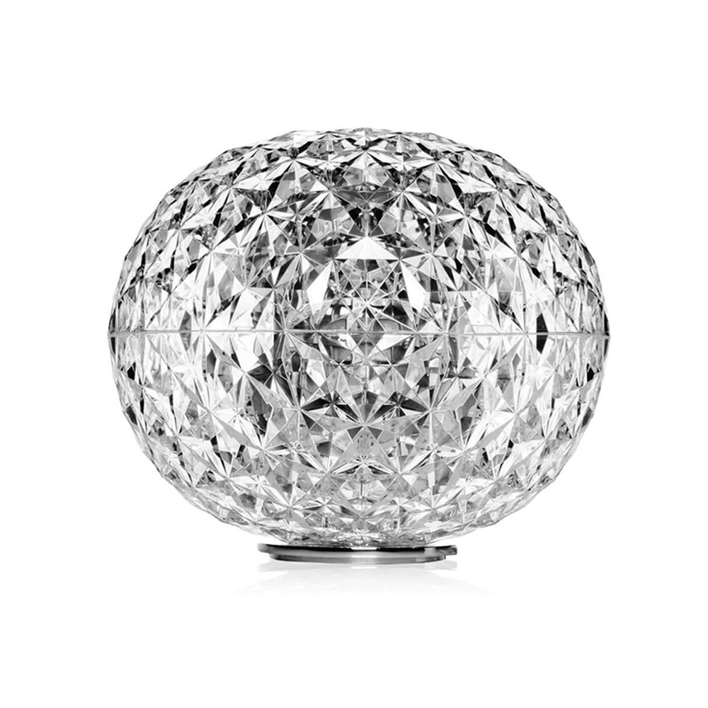 Lámpara de sobremesa baja realizada en tecnopolímero termoplástico transparente o teñido en pasta, provoca un rico juego de reflejos gracias a su superficie tallada interior y exterior.