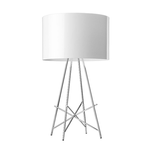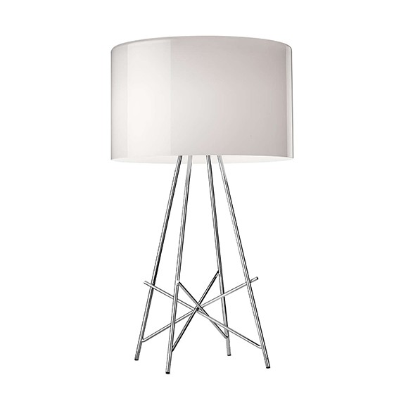 Lámpara de sobremesa para interiores de luz difusa donde una estructura "elemental", según el diseñador Rodolfo Dordoni, similar a un faro marino y una torre eléctrica sostiene la fuente de luz.