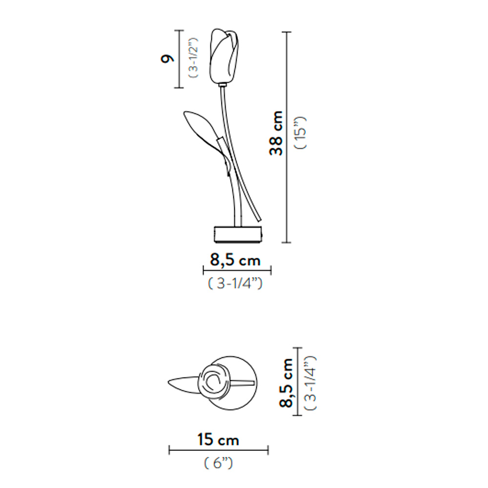 El tallo de aluminio anodizado soporta una corola de Lentiflex® ensamblada a mano y termoformada, que encierra una fuente de luz LED, dando lugar a una flor de ensueño que, ligeramente inclinada, parece florecer y moverse por el aire como si dialogara con el espacio circundante