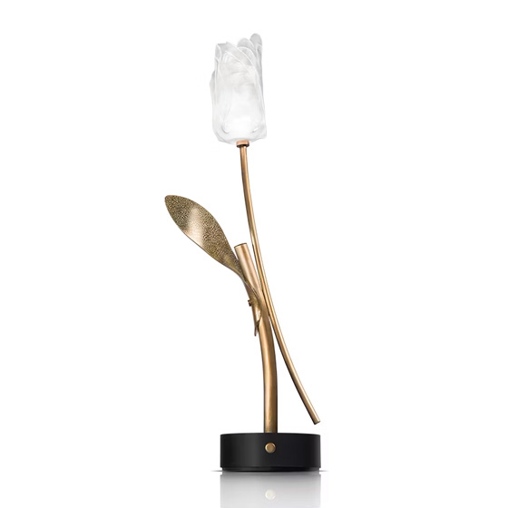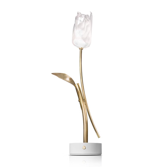 La lámpara de sobremesa Tulip, una romántica instalación luminosa de Marc Sadler, se ofrece en versión de mesa con batería recargable, capaz de moverse con la simpleza de un gesto para ofrecer escenarios siempre nuevos.