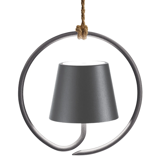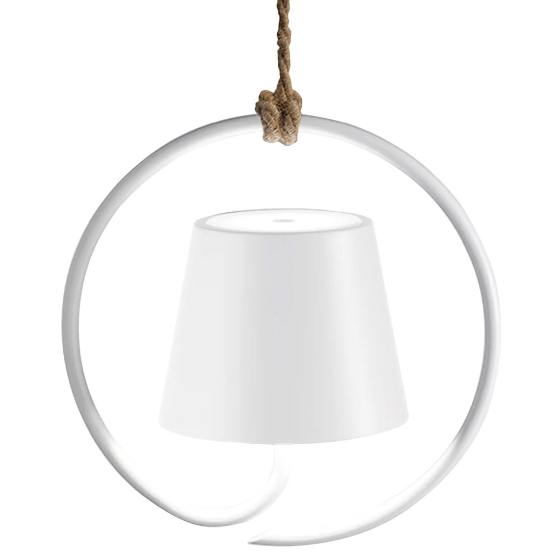 Lámpara colgante recargable con luminaria de aluminio pintado mate, difusor de policarbonato y fuente de luz LED.