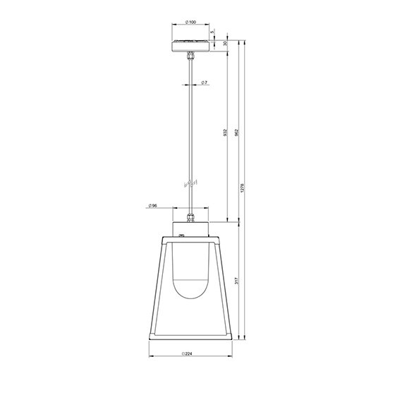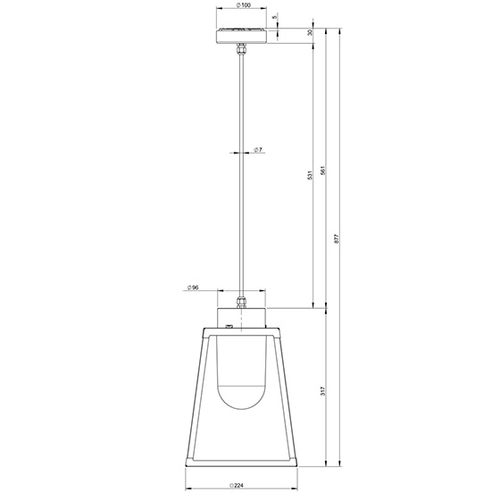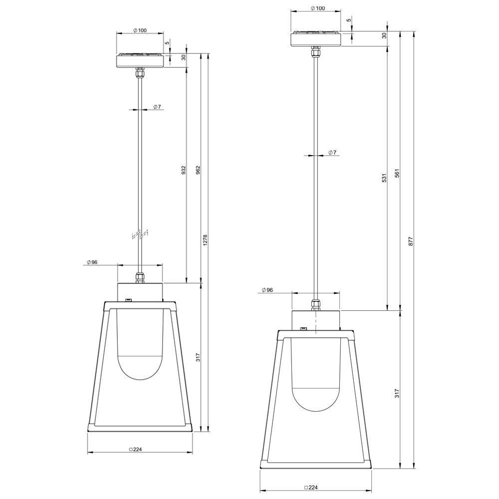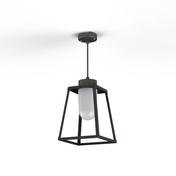 La lámpara suspensión LAMPIOK 1 Modelo número 3 y 4 cuenta con una estructura de aluminio, E27, IP65, clase 2, y difusor de vidrio transparente o esmerilado.