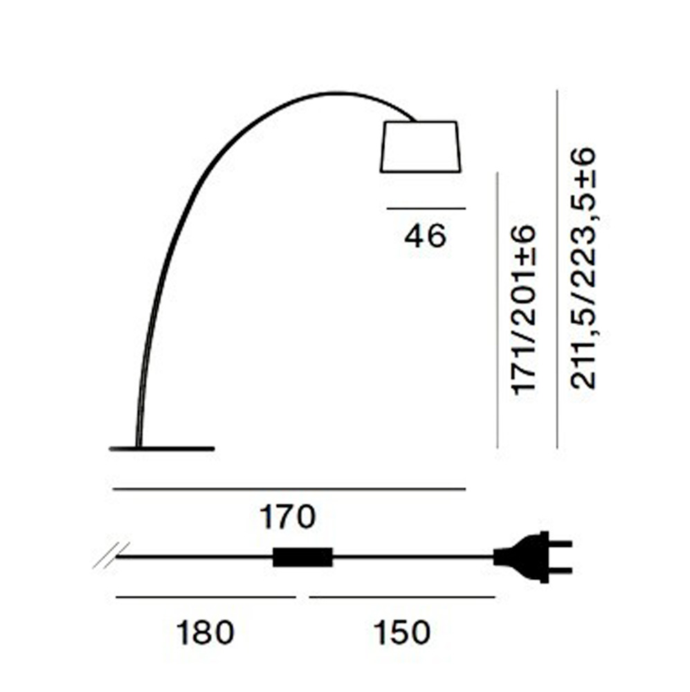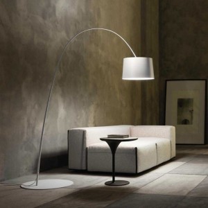 La lámpara de pie Twiggy de la marca italiana Foscarini tiene un diseño compuesto por una línea delgada y arqueada, un elemento flexible que como magia logra sostener en el aire una gran pantalla.