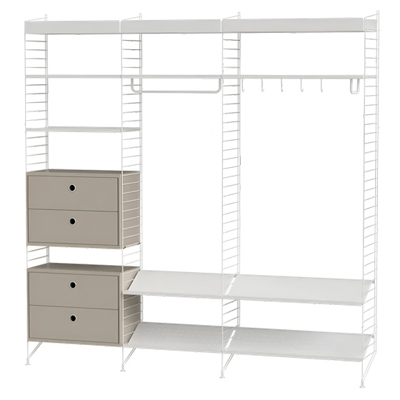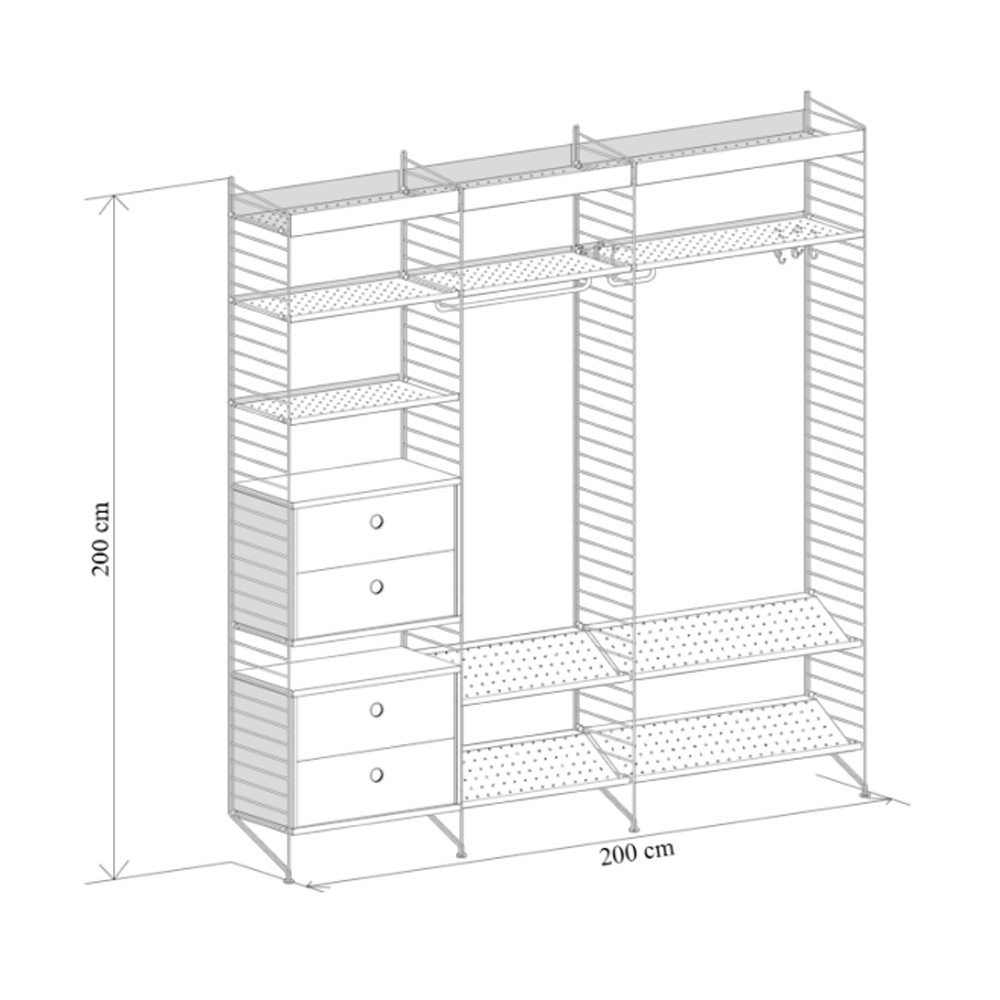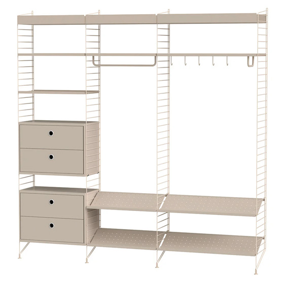 Fabricado en metal y tablero chapado de madera, permite elegir combinaciones en diferentes colores y configuraciones. Su diseño escandinavo, basado en los paneles de rejilla metálica creados en 1949 por Nisse y Kajsa Strinning, garantiza funcionalidad y adaptabilidad.