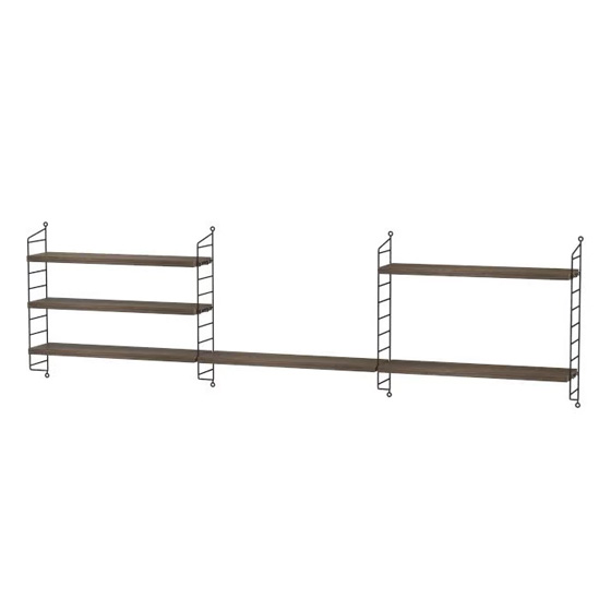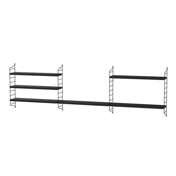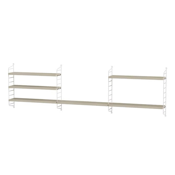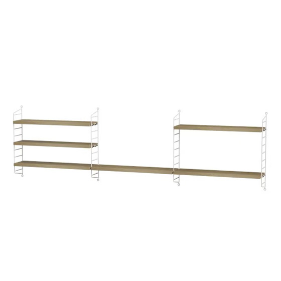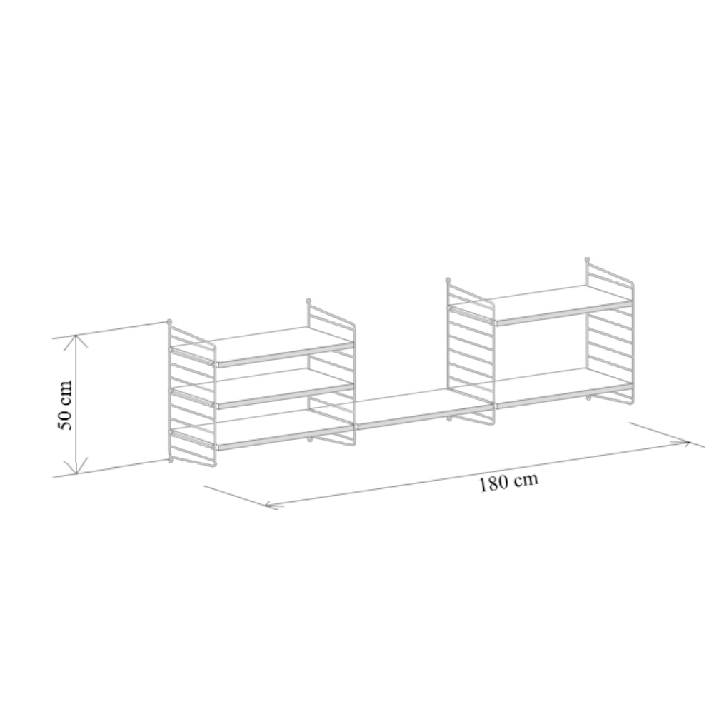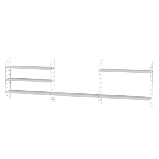 Sistema de almacenamiento mural con tres secciones que permite organizar libros, juguetes y objetos personales de forma práctica. Cuenta con estantes de acero lacado con textura fina y soportes laterales de acero, fijados a la pared en dos puntos para una instalación segura.
