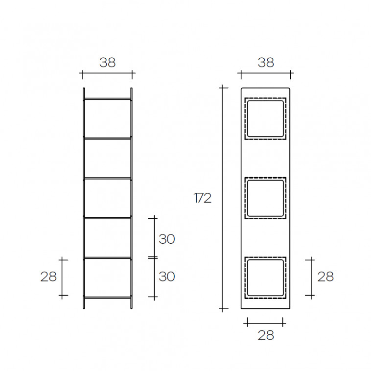 Librería con cubos contenedores de vidrio. Dimensiones: 38x38x172h cm.
