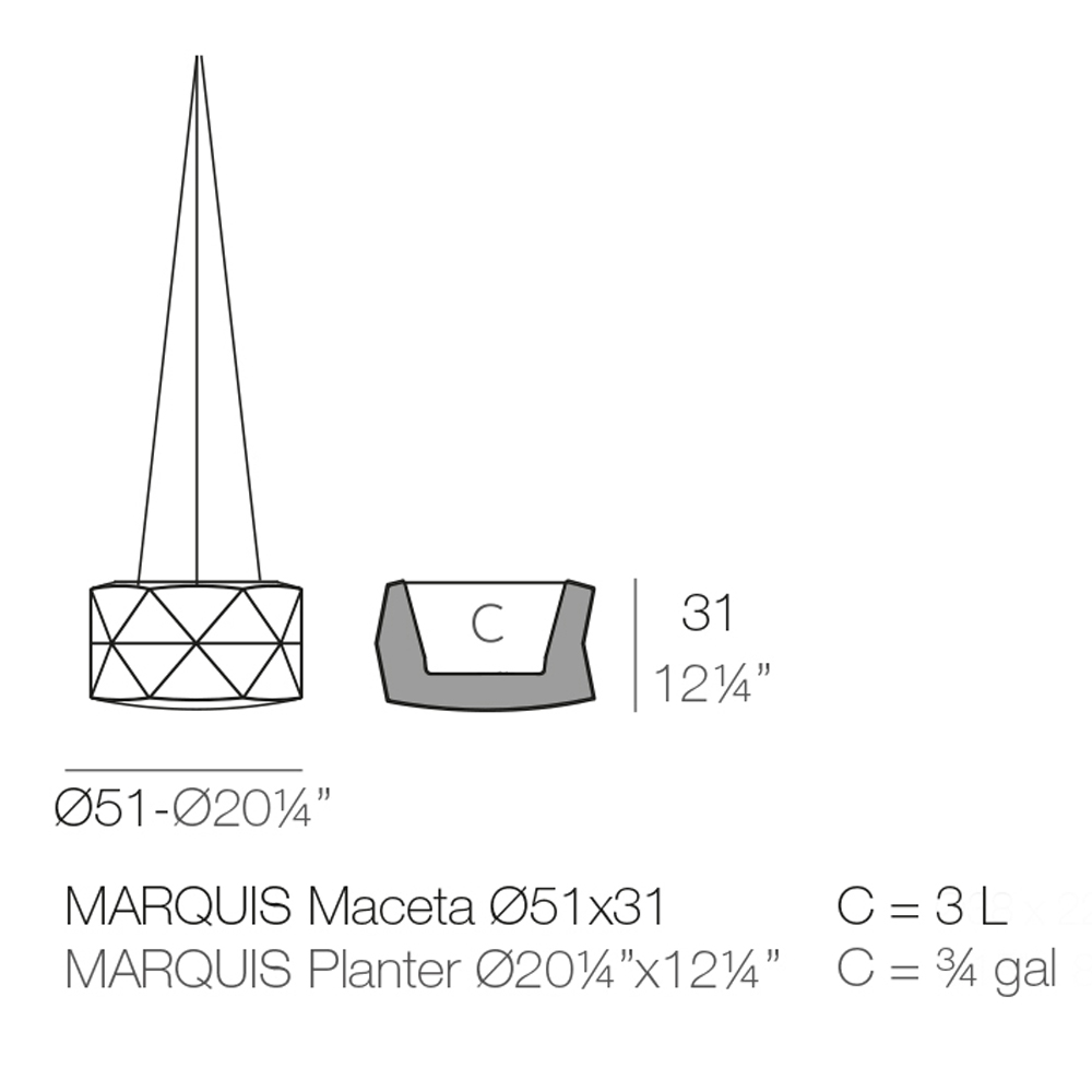 Macetero de diseño colgante fabricado en resina de polietileno mediante moldeo rotacional con doble pared, 100% reciclable. Producto apto tanto para interior como exterior.