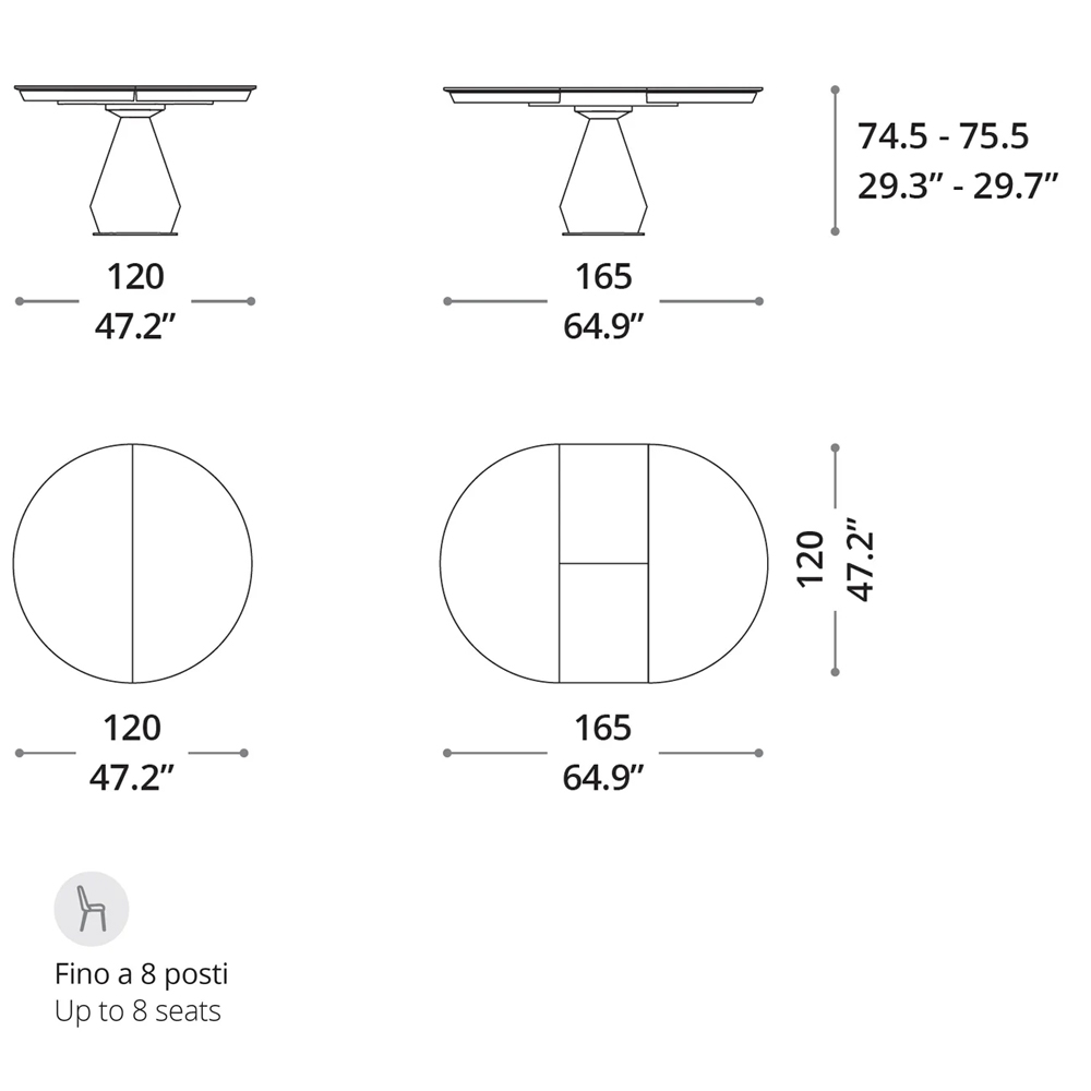 El concepto Lycos evoca la forma de un alfil, dominando la escena con elegancia sólida. El sobre es redondo, listo para expandirse hacia nuevas experiencias. Una mesa esculpida según las necesidades de tu día a día, con superficies y extensiones disponibles en varios materiales. Mesa de comedor extensible con base y marco de metal pintado o acabado en cemento. En la terminación del sobre de Marble Glass, la superficie y la extensión mantienen continuidad en el diseño tanto cerrado como abierto, mientras que en la versión de cerámica, las vetas son continuas cuando la mesa está cerrada. Extensión interna en laminado para los acabados de cristal, cristal antihuellas y cerámica.