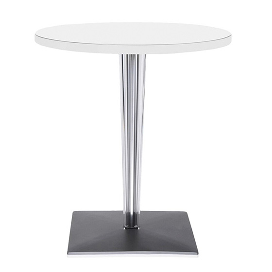 La línea de mesas TopTop se distingue por su característico diseño de pata, disponible en sección redonda o cuadrada, con una superficie transparente multifacetada y un núcleo metálico.