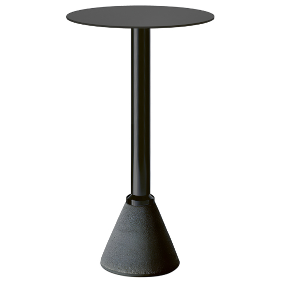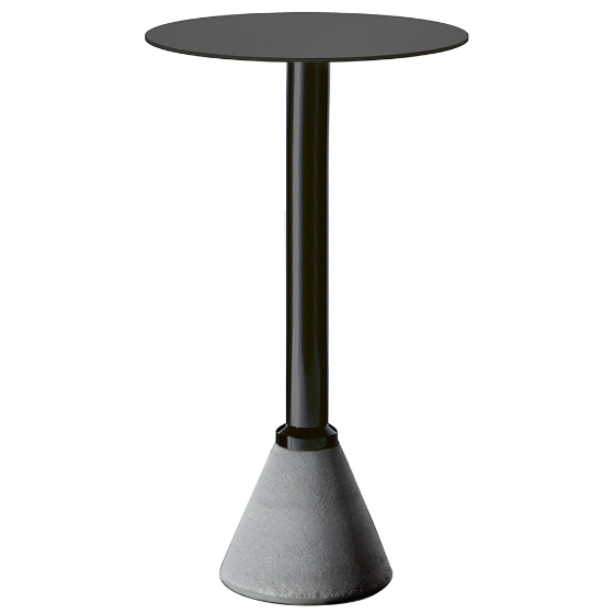 Mesa alta con sobre redondo de HPL y base de hormigón. Dimensiones: Ø60x110h cm.