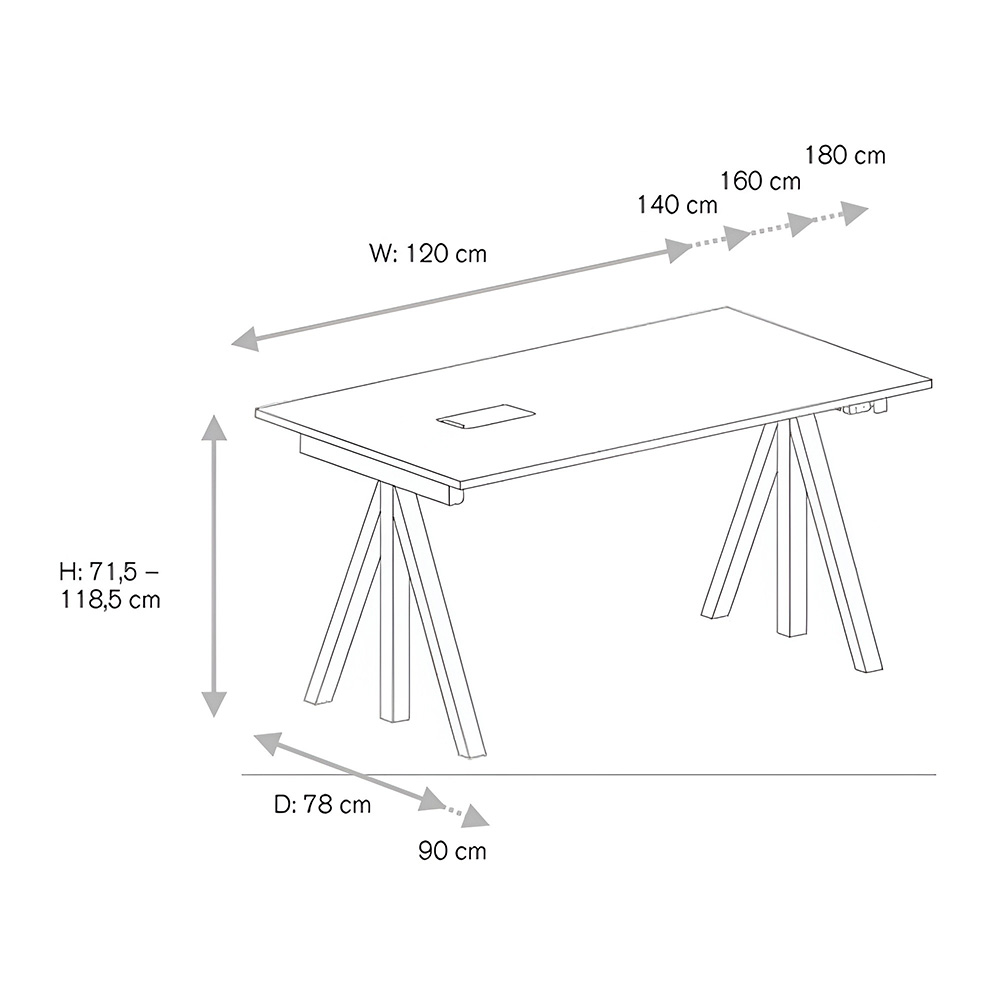 Los escritorios con 78 cm de profundidad están disponibles en tres anchos: 120, 140 y 160 cm.