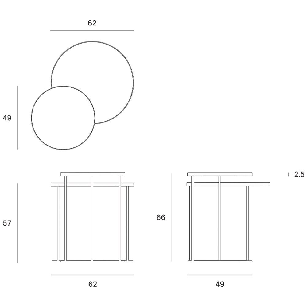 Conjunto de 2 mesitas con sobre redondo de madera y estructura de metal.