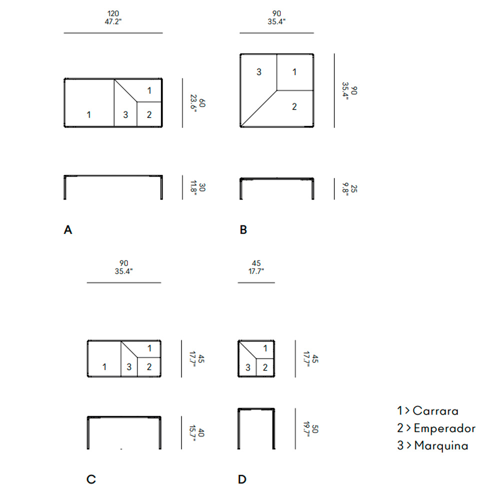 Esta mesa moderna está elaborada con una estructura de metal pintado bronce y un sobre en mármol de Carrara, Emperador y Marquina.