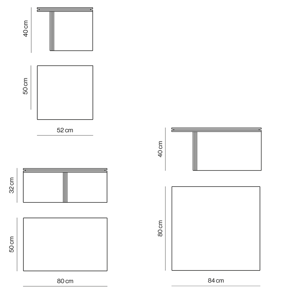 Las alturas y formas de las mesas están concebidas para superponerse, formando conjuntos armoniosos. Con alturas de 32 y 40 centímetros para mesas cuadradas y rectangulares, y 32 y 42 centímetros para las redondas, cada pieza ofrece un equilibrio perfecto entre atractivo estético y funcionalidad.