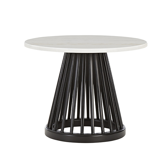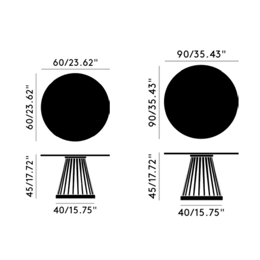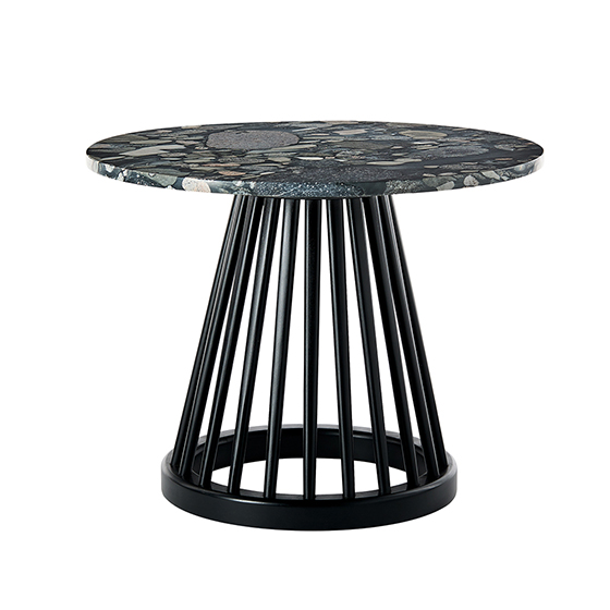 Fabricadas en madera de roble o abedul y compuestas por una serie de ejes de madera torneados, las mesas Fan presentan una base cónica y estilizada, complementada con una superficie de mármol.