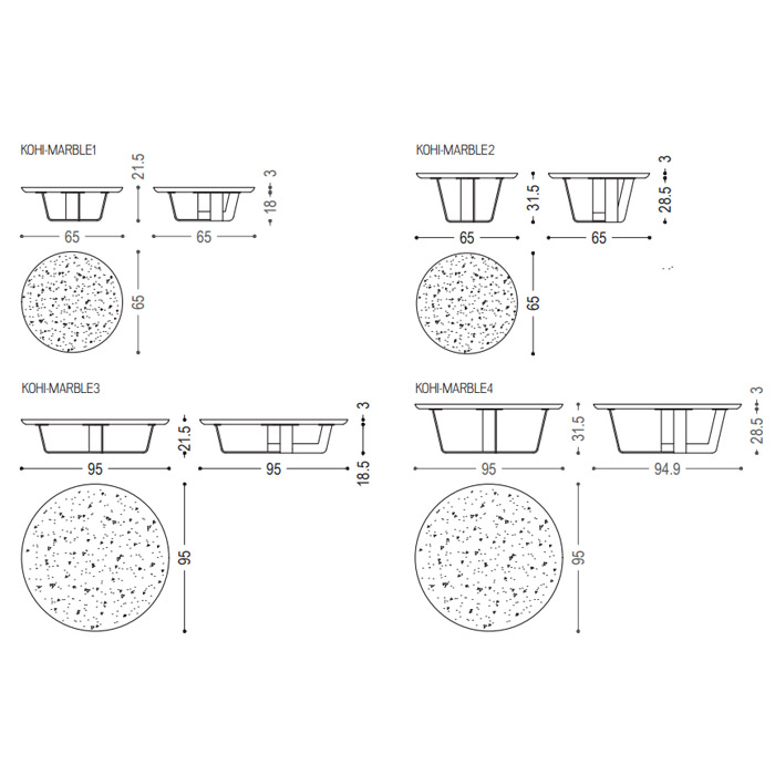 Mesa pequeña redonda con tablero de mármol y base de hierro. Disponible en diferentes tamaños y apilable.