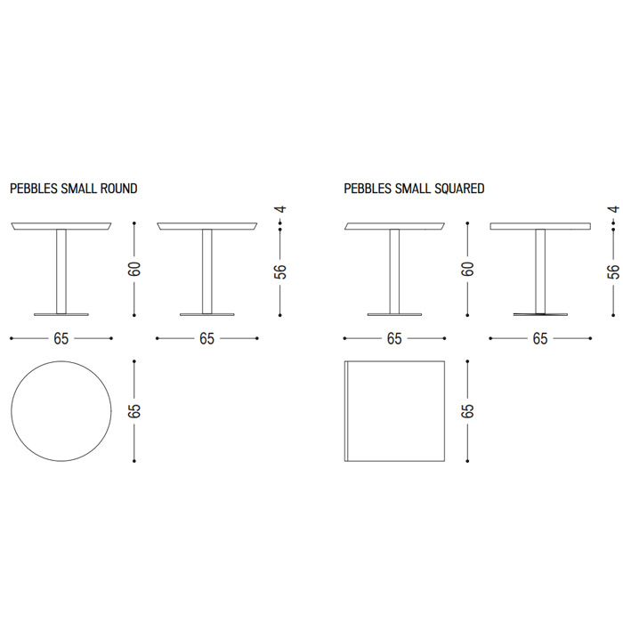 Mesa pequeña redonda o cuadrada con tablero de listones encolados de madera maciza, con cantos oblicuos que facilitan su unión con otros elementos. Pata y base de hierro.