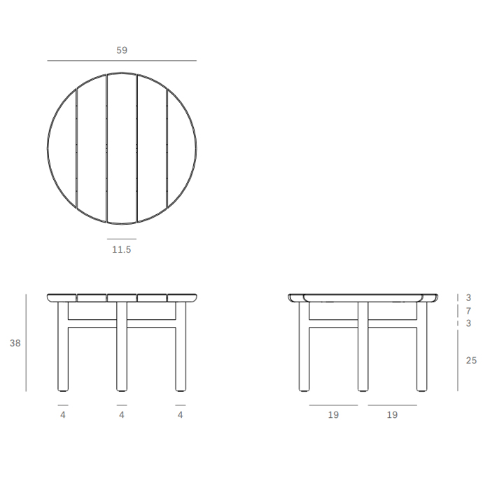 Fabricada con una estructura de madera de teca maciza y un sobre redondo acalanado.