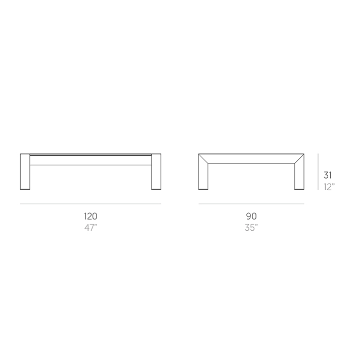 Mesa baja para exteriores con base de aluminio. Dimensiones: 120x90x31h cm.