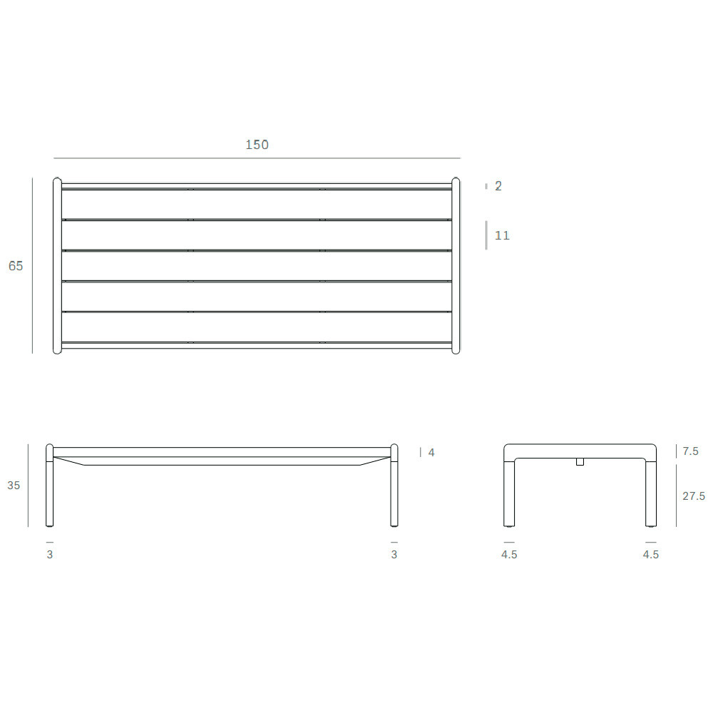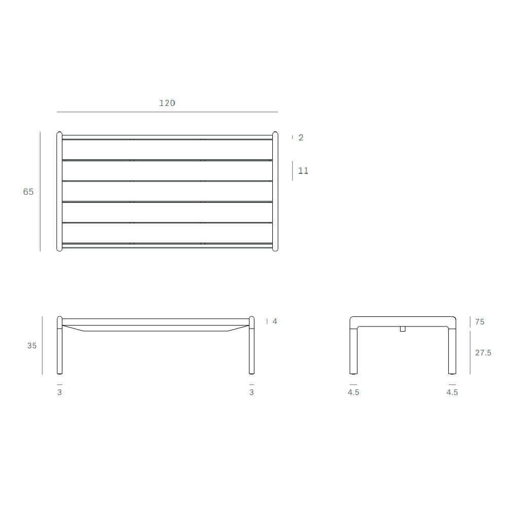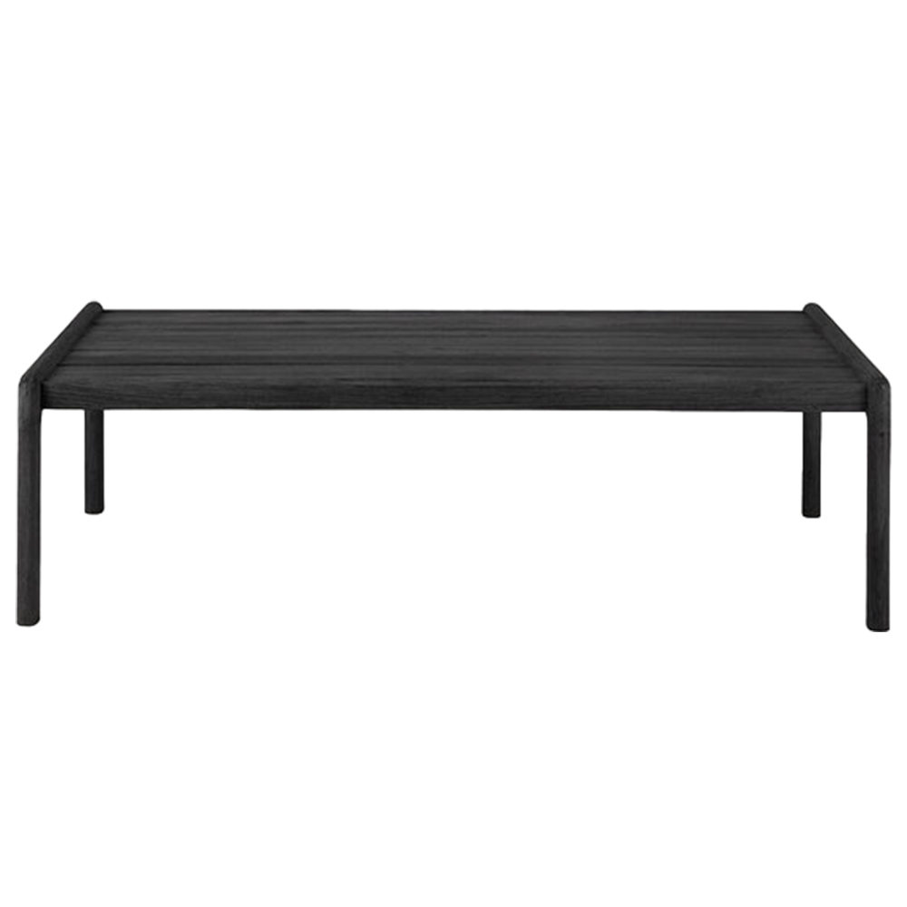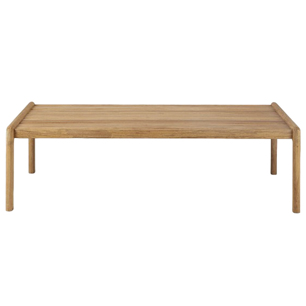 Mesa de centro exterior con sobre rectangular y estructura de teca maciza. Diseño por Jacques Deneef