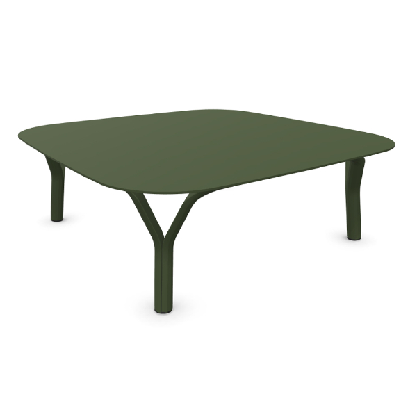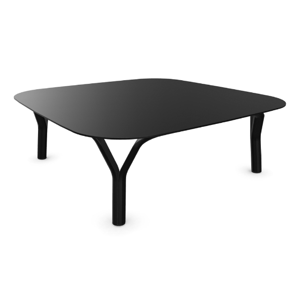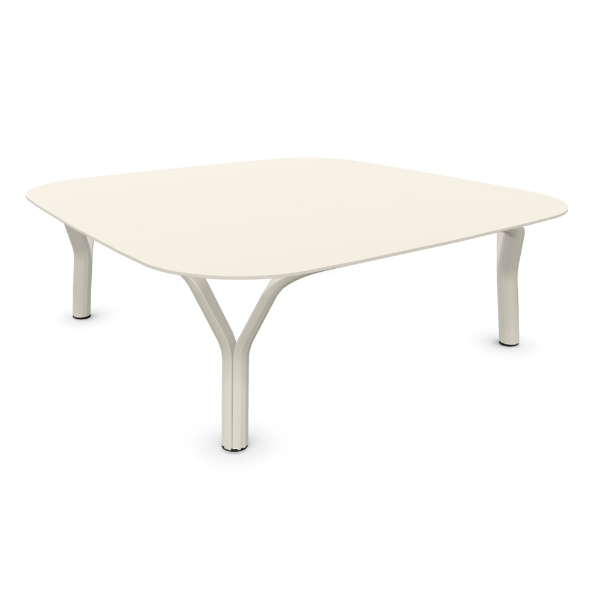 Mesa baja cuadrada con 4 patas de aluminio pintado. Dimesiones: 90x90x30-45h cm