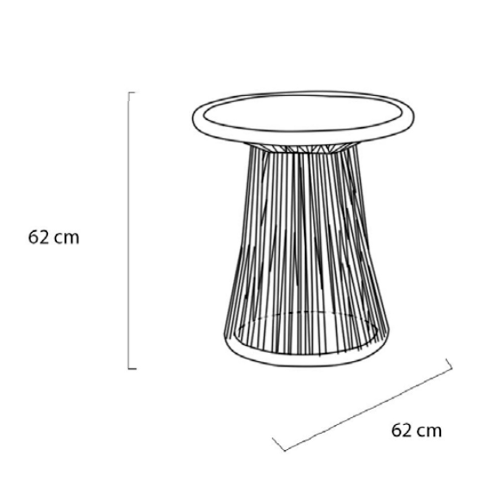 Mesa rincón con sobre de cristal y estructura de cuerda y aluminio. Dimensiones: Ø60x62h cm.