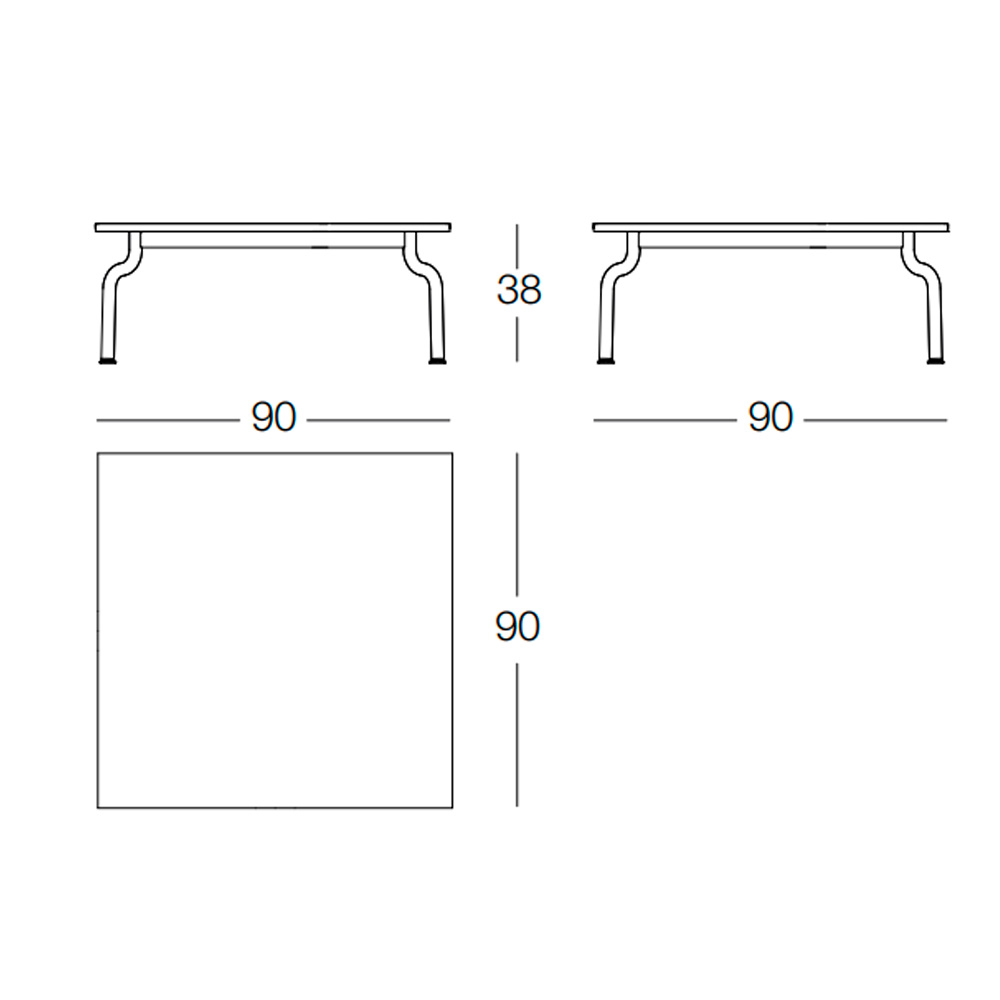 Mesa de centro con sobre cuadrado de chapa de acero. Dimensiones: 90x90x38h cm.