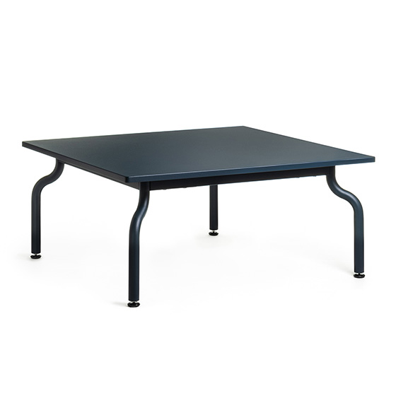 La colección South incluye esta mesa de centro de 90x90 cm con tapa en chapa de acero y una estructura de tubo de acero.