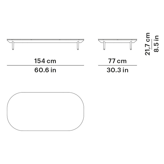 Mesa centro rectangular con sobre HPL o porcelánico. Dimensiones: 154x77x21,7h cm
